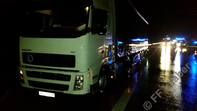 Ein PKW Fahrer verlor bei nasser Fahrbahn die Kontrolle über sein Fahrzeug und kam auf dem Dach liegend damit zu stehen. Ein weiterer LKW wurde beschädigt. Die Unfallstelle wurde ausgeleuchtet, abgesichert und auslaufende Betriebsstoffe wurden gebunden.