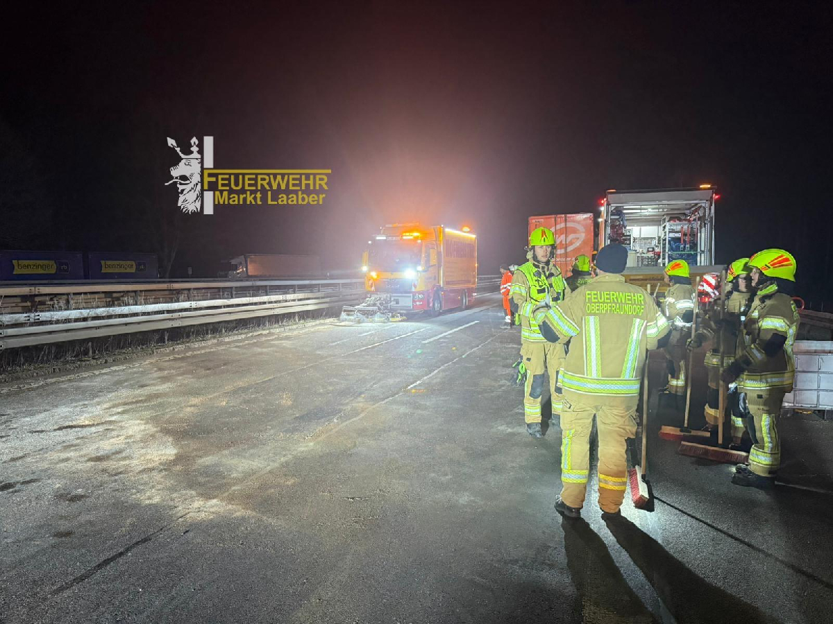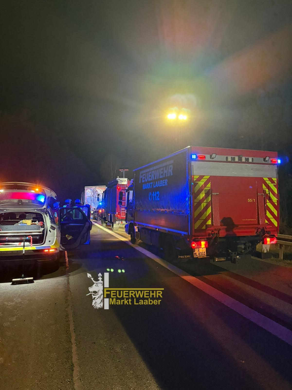 Gegen 21:30 alarmierte uns die Integrierte Leitstelle Regensburg (ILS) mit dem Stichwort THL 2 Verkehrsunfall LKW/ Bus (leer) ohne eingeklemmte Person auf die Autobahn 3 in Fahrtrichtung Nürnberg. Kurz nach unserem Ausrücken, änderte sich die Einsatzörtlichkeit, der Unfall war, entgegen der ersten Meldung zwischen Beratzhausen und Laaber. Aufgrund dessen wurde die Feuerwehr Oberpfraundorf, der Kreisbrandmeister Land 2/2 und der VSA der Feuerwehr Parsberg nachalarmiert. Vor Ort konnten zwei kollidierte LKW vorgefunden werden, wir sicherten die Einsatzstelle, leuchteten diese aus und banden auslaufende Betriebstoffe. Die Fahrbahn war für einen landenden Rettungshubschrauber komplett gesperrt, dieser landete nicht, da er dann nicht benötigt wurde. Die verunfallten Lkw wurdem durch ein Abschleppunternehmen geborgen. Die verschmutze Fahrbahn wurde durch eine spezielle Reinigungsmaschine gesäubert. Als sämtliche Maßnahmen abgeschlossen waren, wurden wir aus dem Einsatz heraus gelöst und konnten somit einrücken.